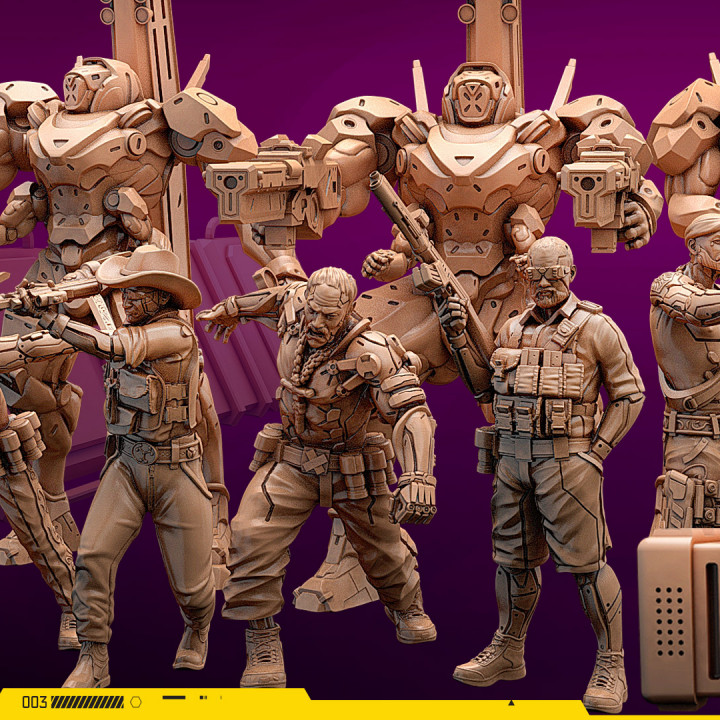 Ein Proxy War Team aus Resin mit Standardbases für Cyberpunk Genre Tabletops wie Human Interface Proxy Wars. Enthalten sind alle abgebildeten Miniaturen ohne Fahrzeuge oder Gelände sowie Standardbases. Für Human Interface Proxy Wars sind Einheitenkarten kostenlos zum selber ausdrucken enthalten. Die Miniaturen sind auch einzeln erhältlich.